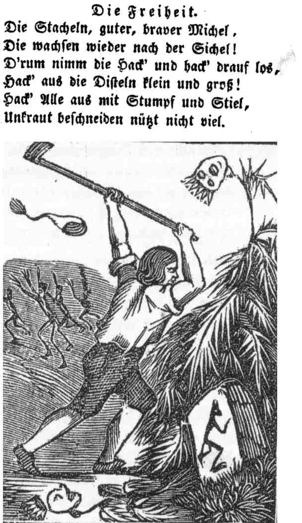 Besonders eine zweiteilige Karikatur, in der der "deutsche Michel" aufgefordert wird, den ständig nachwachsenden Disteln (mit Kronen) nicht nur die Stacheln abzuhacken, sondern auch das "Unkraut mit Stumpf und Stil" zu beseitigen, erhitzte die Gemüter. In Karlsruhe wurde diese Karikatur als Aufruf, zur Waffe zu greifen und alle Fürsten und Könige zu beseitigen, gedeutet. Diese günstige Gelegenheit wurde genutzt, um den "agilsten Republikaner der Ortenau mundtot" zu machen. Die Regierung ging gegen den Redakteur Hofer vor, der hauptsächlich für die revolutionäre Stimmung auch nach Beendigung des "Schutterboten" verantwortlich gemacht wurde.